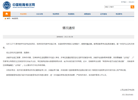 6月8日,中国教育考试网发布情况通报,涉数学全国乙卷事,系考中作弊,甘肃某考生违规携带手机进入考场,开考后拍摄试卷发至QQ群寻求解答未果。涉数学全国新高考I卷事,系恶意编辑“占坑帖”,广东某考生考前在QQ空间发布无关帖子占位,考后再用试卷内容替换原有内容,帖子时间仍显示开考前。此外,安徽某考生自称“考前押中语文全国乙卷试题”,同样是考后恶意编辑的“占坑帖”。以上情况均不存在考前泄题。