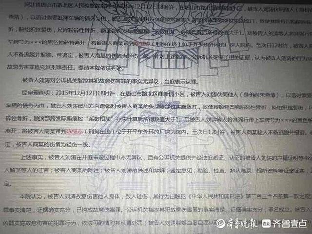 记者查阅中国裁判文书网发现,2015年12月12日18时许,在唐山市路北区闻新园小区,被告人刘某伙同他人(身份尚未查清),以追讨索要抵押车辆的债务为由,被告人刘某使用方向盘锁对被害人商某的头部等部位实施殴打,致使其额骨凹陷粉碎性骨折,脑组织挫裂伤,尺骨粉碎性骨折,额顶部跨发际瘢痕按“系数相加”办法计算后所得数值大于1。后被告人刘某等人将其强行带上车牌号为×××的黑色帕萨特离开,将被害人商某带到陈继志(刑拘在逃)位于开平东外环的厂房大院内。至次日12时许,被害人商某趁人不备逃脱并报警。经鉴定,被害人商某的伤情为轻伤一级。