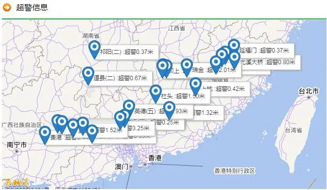 截至今天14时,多个水文站超警。图源自全国水雨情信息网站