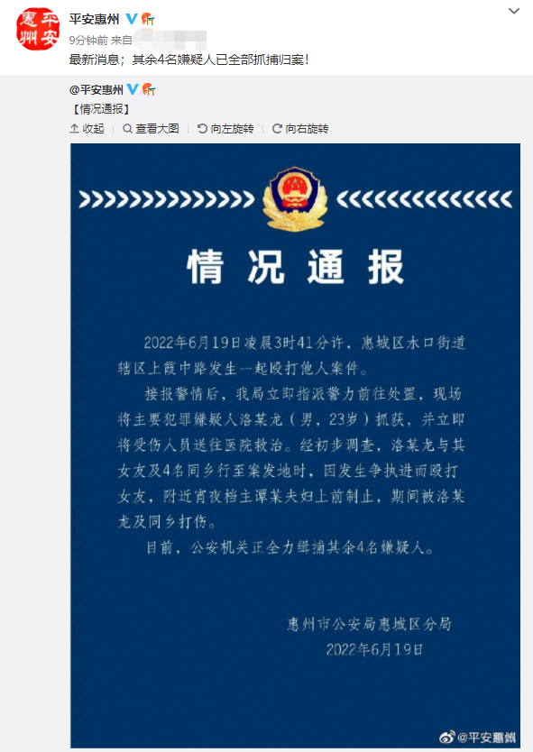 惠州警方通报打人案:5名嫌疑人已抓获归案