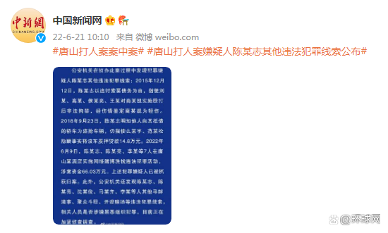 据河北公安通报,公安机关在侦办此案过程中发现犯罪嫌疑人陈某志其他违法犯罪线索: 2015年12月12日,陈某志以追讨索要债务为由,指使刘某、高某、侯某亮、王某对商某凯实施殴打后非法拘禁,经伤情鉴定商某凯为轻伤。2018年9月23日,陈某志明知他人向其抵债的轿车为盗抢车辆,仍指使么某宇、范某松隐瞒事实将该车质押贷款14.8万元。2022年6月9日,陈某志、陈某亮、李某等7人在唐山某酒店实施网络赌博洗钱违法犯罪活动,涉案资金66.03万元。上述犯罪嫌疑人已被抓获归案。此外,公安机关还发现陈某志、陈某亮、沈某俊、马某齐、李某等人其他寻衅滋事、聚众斗殴、开设赌场等违法犯罪线索,相关人员是否涉嫌黑恶组织犯罪,目前正在加紧侦查调查。
