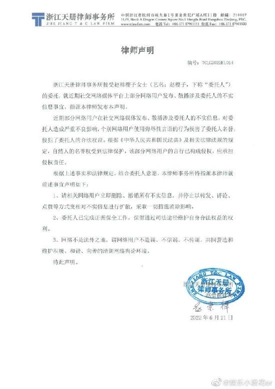 新浪娱乐讯 21日,赵樱子工作室就近期社交网络媒体平台上部分不实信息发布律师声明,表示相关侵权行为已取证,对于不符合事实的谣言会依法追究,合理维护艺人正当权益,呼吁杜绝一切造谣行为,坚决抵制网络暴力,希望广大网络用户与我们共同维护良好的网络环境。随后,赵樱子本人也在微博发文表态:“作为艺人,我接受大家的指点,但作为女生,我不接受这些突破底线的指指点点。 ”