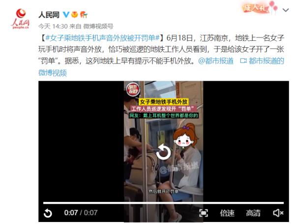 6月18日,江苏南京,地铁上一名女子玩手机时将声音外放,恰巧被巡逻的地铁工作人员看到,于是给该女子开了一张“罚单”。据悉,这列地铁上早有提示不能手机外放。