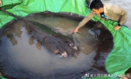据印度新德里电视台20日消息,柬埔寨当地村民日前在湄公河捕获了一条重300公斤的黄貂鱼,需十几个人拖上岸。研究人员称,这是全球目前已知的最大淡水鱼。