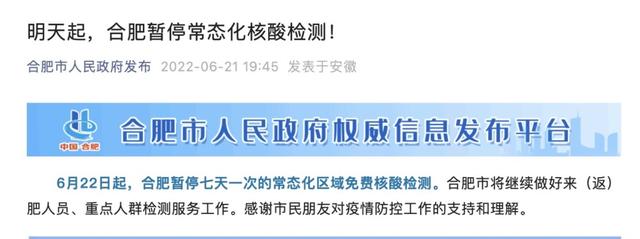 6月21日,合肥市人民政府发布消息,6月22日起合肥暂停七天一次的常态化区域免费核酸检测。同时将继续做好来(返)肥人员、重点人群检测服务工作。此前,合肥曾在6月18日宣布将核酸检测调整为每7天开展1次。