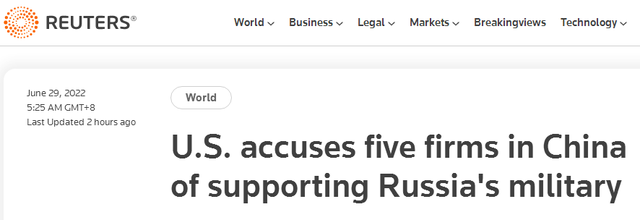 “美方指责5家中国公司支持俄罗斯军队”,路透社29日以此为题报道称,拜登政府当地时间28日将5家中国企业列入贸易黑名单,理由是这些中企“涉嫌支持俄罗斯军事和国防工业”。路透社称,中国驻美大使馆对此表示,中方没有向俄罗斯或乌克兰提供军事援助,并称将采取“必要措施”来保护中国公司的权益。