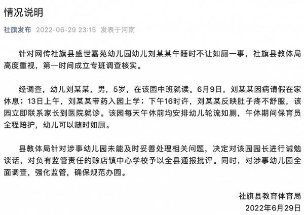 央视网消息:据“社旗发布”微信公众号消息,社旗县教育体育局6月29日发布情况通报称,针对网传社旗县盛世嘉苑幼儿园幼儿刘某某午睡时不让如厕一事,社旗县教体局高度重视,第一时间成立专班调查核实。
