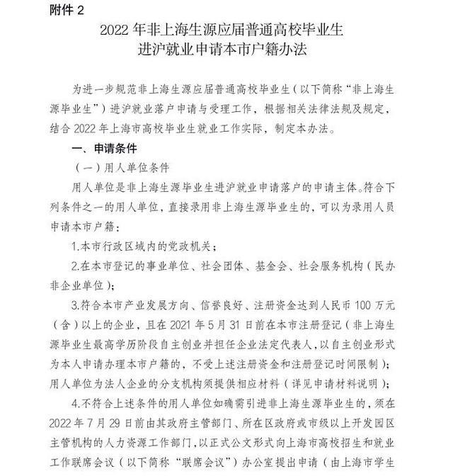 根据6月28日公布的《2022年非上海生源应届普通高校毕业生进沪就业申请本市户籍办法》,申请条件包括“用人单位条件”和“非上海生源毕业生条件”。