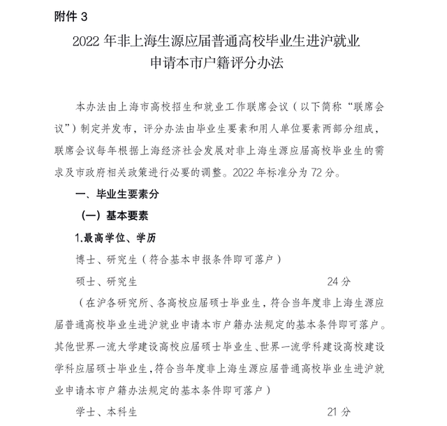 2022年,非上海生源应届普通高校毕业生进沪就业申请上海户籍评分办法再次调整 本文图片均为文件截图而2021年公布的户籍评分办法要求,“世界一流大学建设高校”应届硕士毕业生、“世界一流学科建设高校”建设学科应届硕士毕业生,符合基本申报条件即可落户。中科院在沪各研究所、上海科技大学、上海纽约大学应届硕士毕业生参照“世界一流大学建设高校”执行。对比可知,今年,不需要打分、符合相应基本条件即可落户的政策范围扩大至“在沪各研究所、各高校应届硕士毕业生”。