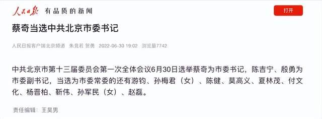 中共北京市第十三届委员会第一次全体会议6月30日选举蔡奇为市委书记,陈吉宁、殷勇为市委副书记,当选为市委常委的还有游钧、孙梅君(女)、陈健、莫高义、夏林茂、付文化、杨晋柏、靳伟、孙军民(女)、赵磊。