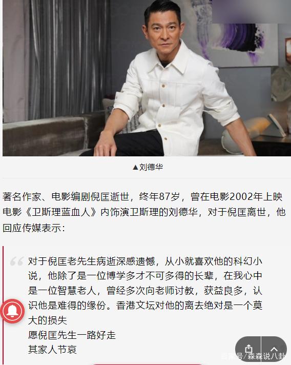 刘德华伤感悼念倪匡:曾经多次向老师讨教,获益良多,愿一路好走