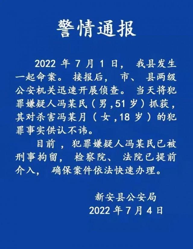 接报后,市、县两级公安机关迅速开展侦查。当天将犯罪嫌疑人冯某民(男,51岁)抓获,其对杀害冯某月(女,18岁)的犯罪事实供认不讳。