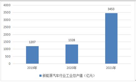 2020年,中国新能源汽车行业工业总产值约为1328亿元,2021年,工业总产值为3453亿元。