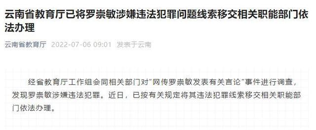 7月6日,云南省教育厅发布消息,经省教育厅工作组会同相关部门对“网传罗崇敏发表有关言论”事件进行调查,发现罗崇敏涉嫌违法犯罪。近日,已按有关规定将其违法犯罪线索移交相关职能部门依法办理。