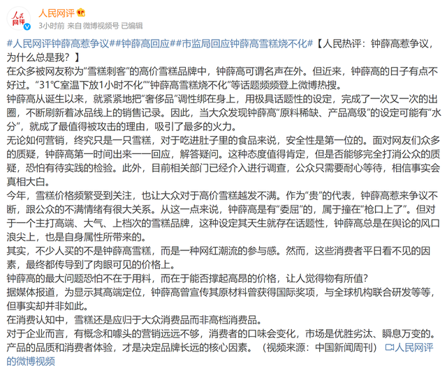 无论如何营销,终究只是一只雪糕,对于吃进肚子里的食品来说,安全性是第一位的。面对网友们众多的质疑,钟薛高第一时间出来一一回应,解答疑问。这种态度值得肯定,但是否能够完全打消公众的质疑,恐怕有待实践的检验。此外,目前相关部门已经介入进行调查,公众只需要耐心等待,相信事实会真相大白。