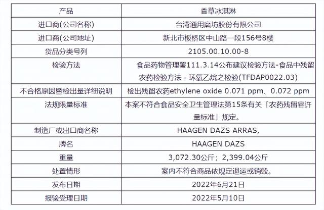 近日,商务部官网日前转载了一篇《法国出口哈根达斯香草冰淇淋被检出农药残留》的文章显示,2022年6月21日,台湾食药署发布边境查验不合格食品名单,其中法国出口两批次哈根达斯香草冰淇淋被发现含有极微量残留农药环氧乙烷。