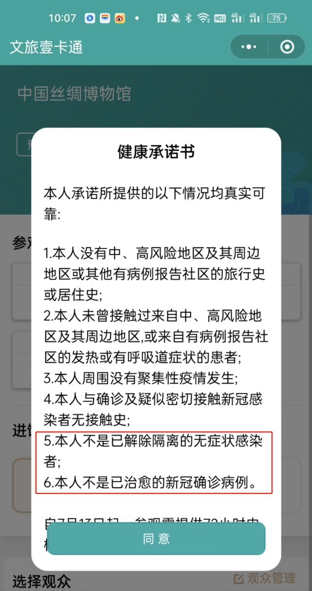 第一财经记者了解到,不仅仅是佛山大剧院,在浙江,也有十几家博物馆对于曾经感染过新冠病毒的人员在预约参观时有一些歧视性规定。据不完全统计,微信小程序“文旅一卡通”中,有13家博物馆或纪念馆要求预约人员填写健康承诺书后方可进行预约。这些博物馆多为事业单位,包括杭州的中国丝绸博物馆、杭州孔庙、富阳博物馆、抗日战争胜利浙江受降纪念馆、中国动漫博物馆,湖州的湖州市科技馆、长兴太湖博物馆、长兴县新四军苏浙军区纪念馆,金华的金华市博物馆、兰溪市博物馆,台州的黄岩博物馆,宁波的中国港口博物馆和温州的瓯海博物馆。