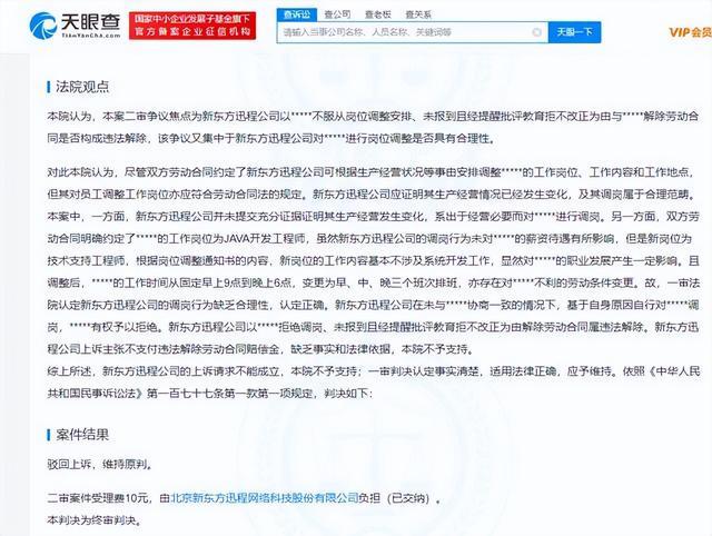 天眼查App显示,近日,北京新东方迅程网络科技股份有限公司与葛某劳动争议二审文书公开。