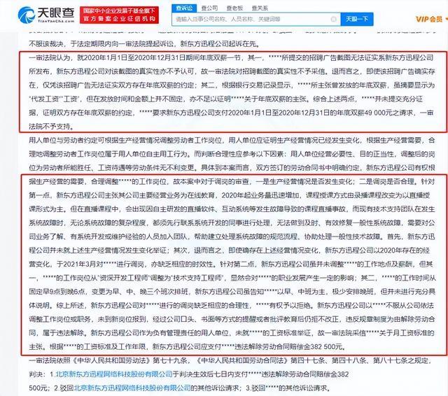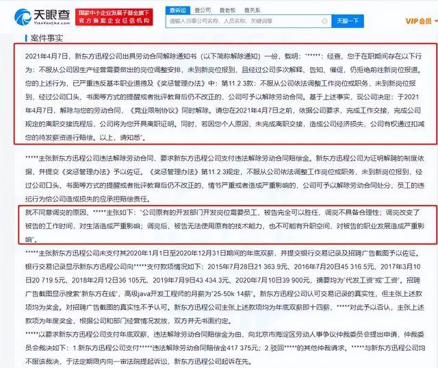 文书显示,新东方以葛某不服从公司因生产经营需要做出的岗位调整安排,未到新岗位报到为由解除劳动合同,葛某认为调岗不具备合理性,要求新东方支付年底双薪和解约赔偿金。一审法院审理认为,葛某提交证据不足以证明关于年底双薪的主张,新东方迅程公司并未就生产经营情况发生变化举证,且葛某从“资深开发工程师”调整为“技术支持工程师”,会对其职业发展产生影响。新东方迅程公司对葛某进行的调岗缺乏相应的合理性,葛某有权拒绝。一审法院裁定,新东方迅程公司支付葛某违法解除劳动合同赔偿金38.25万元。