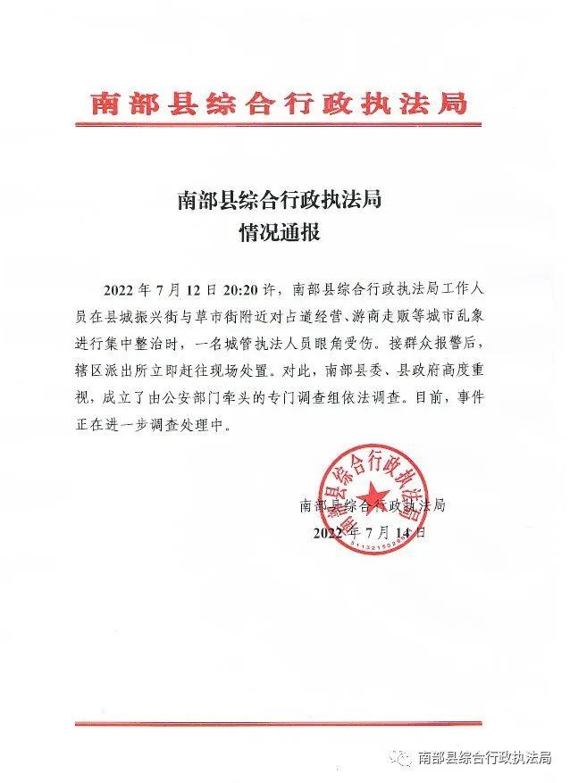 南部县综合行政执法局微信公众号7月14日通报,7月12日20:20许,南部县综合行政执法局工作人员在县城振兴街与草市街附近对占道经营、游商走贩等城市乱象进行集中整治时,一名城管执法人员眼角受伤。接群众报警后,辖区派出所立即赶往现场处置。对此,南部县委、县政府高度重视,成立了由公安部门牵头的专门调查组依法调查。目前,事件正在进一步调查处理中。