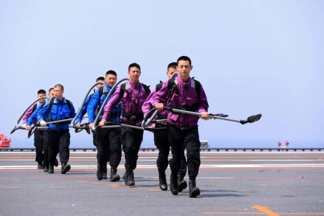 ▲飞行保障人员甲板作业