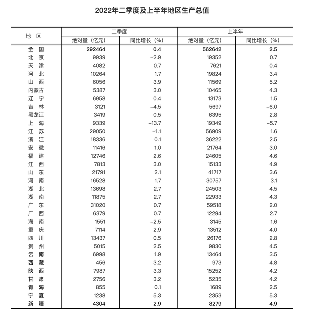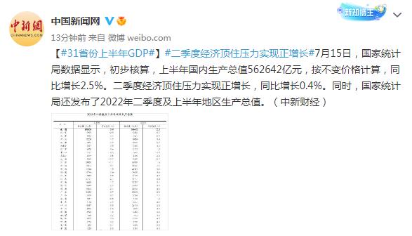 【31省份上半年GDP】7月15日,国家统计局数据显示,初步核算,上半年国内生产总值562642亿元,按不变价格计算,同比增长2.5%。二季度经济顶住压力实现正增长,同比增长0.4%。同时,国家统计局还发布了2022年二季度及上半年地区生产总值。(中新财经)