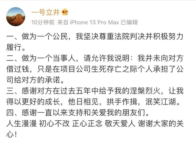 一、作为一个公民,我坚决尊重法院判决并积极努力履行。二、作为一个当事人,请允许我说明:我并未向对方借过钱,只是在项目公司生死存亡之际个人承担了公司给对方的承诺。三、感谢对方在过去五年中给予我的涅槃烈火,让我得以更好的成长,他日相见,拱手作揖,泯笑江湖。四、感谢一直以来支持和关爱我的朋友们。人生漫漫、初心不改、正心正念、敬天爱人。谢谢大家的关心!