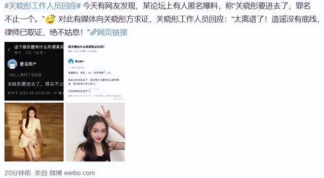对于这样恶劣的传言,有媒体求证关晓彤工作人员,工作人员回应:“太离谱了!造谣没有底线,律师已取证,绝不姑息!” 看得出来,关晓彤方对于这个谣言很气愤,的确,爆料也太离谱了,因为这些爆料都是严重违法,嫌疑人肯定早就被抓了。而关晓彤最近还有现身,根本不符合。