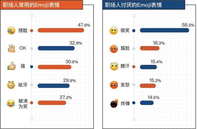 中国青年报客户端讯(中青报·中青网记者 孟佩佩)你的手机中保存了多少网络表情?如今,网络表情已经从Emoji符号扩展到了图片、全民自制表情包,也成为职场社交沟通中的一种表达方式。前程无忧近日向数千职场人发起的Emoji社交沟通使用调查显示,网络表情已经成为沟通“刚需”,近半数的受访职场人最常用“捂脸”,其次是“ok”和“强”,不喜欢的表情里,近六成受访职场人默契地把“微笑”选到了第一位。