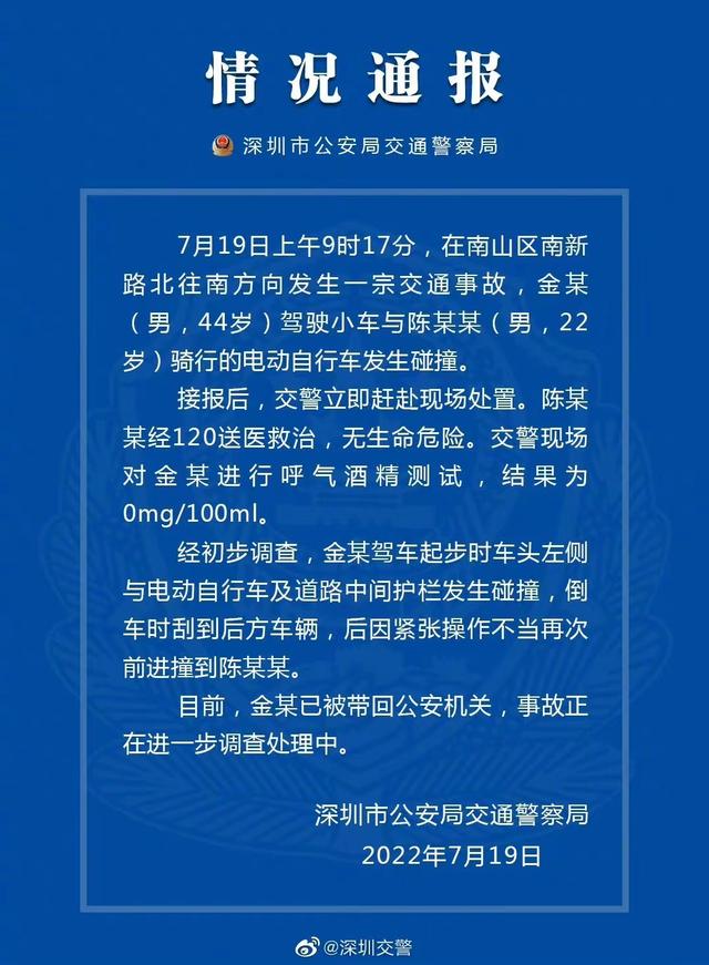@深圳交警 微博通报,7月19日上午9时17分,在南山区南新路北往南方向发生一宗交通事故,金某(男,44岁)驾驶小车与陈某某(男,22岁)骑行的电动自行车发生碰撞。