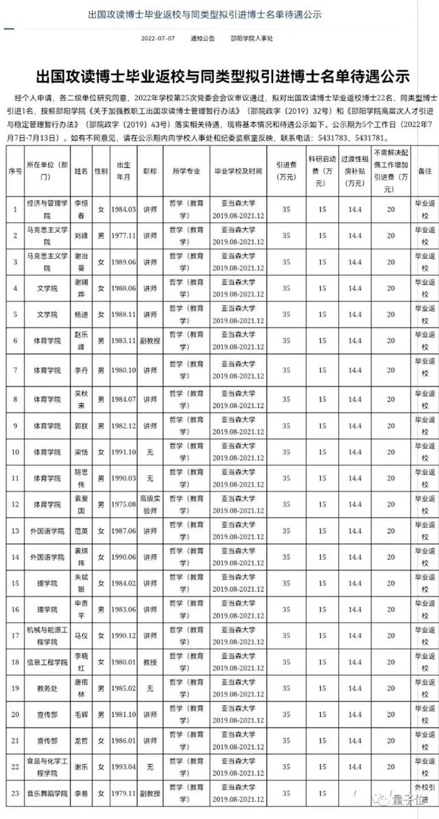 值得关注的是,这23名博士里有22名原本就是邵阳学院的工作人员,职称包括讲师、副教授、高级实验师等,备注均为“毕业返校”,这22人平均引进费用84.4万元。
