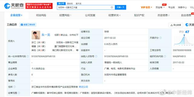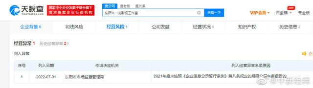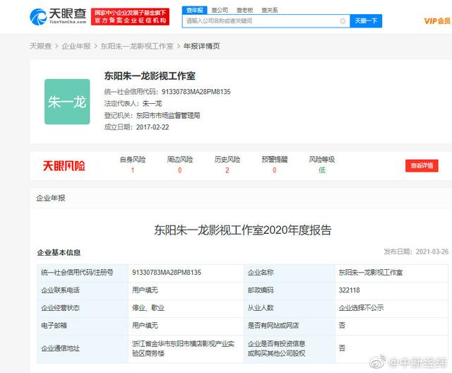 天眼查App显示,近日,东阳朱一龙影视工作室因未按期公示去年年度报告,被东阳市市场监督管理局列入经营异常名录。该工作室成立于2017年2月,为朱一龙个人独资企业。值得一提的是,据2020年年报显示,该工作室为停业、歇业状态。