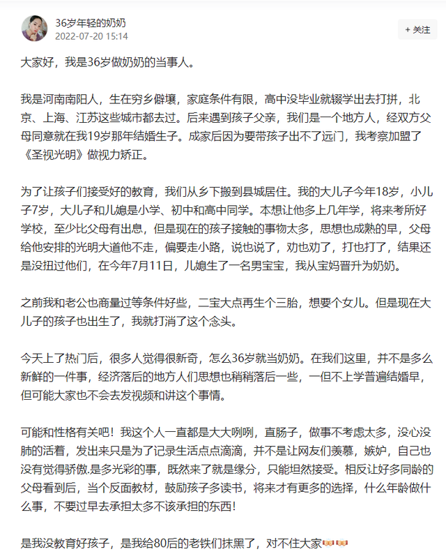 7月20日,该事件当事人在社交平台上发文回应了此事,她在文中介绍自己19岁那年结婚生子,大儿子今年18岁,小儿子7岁,今年7月11日,儿媳生了一名男宝宝,她从宝妈晋升为奶奶。
