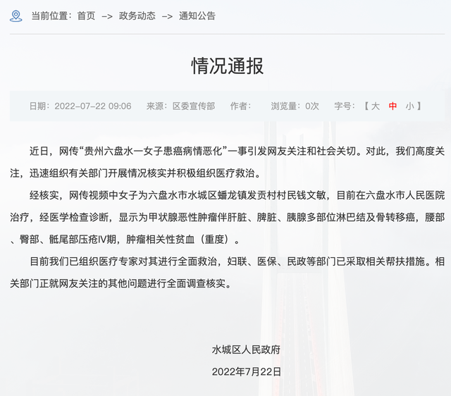 新京报讯 7月22日,六盘水水城区政府发布情况通报:近日,网传“贵州六盘水一女子患癌病情恶化”一事引发网友关注和社会关切。对此,我们高度关注,迅速组织有关部门开展情况核实并积极组织医疗救治。
