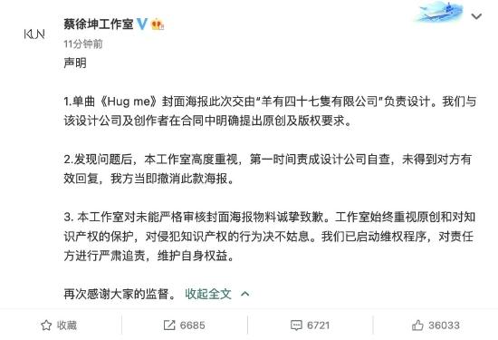 新浪娱乐讯 7月22日,蔡徐坤发布了新专辑封面图,随后被指疑似抄袭电影《遭遇陌生人》海报,有网友做了重叠图做对比,发现极为重合,随后蔡徐坤更换了专辑封面图。23日,蔡徐坤工作日发布声明,称与设计公司及创作者在合同中明确提出原创及版权要求:“发现问题后,本工作室高度重视,第一时间责成设计公司自查,未得到对方有效回复,我方当即撤消此款海报。本工作室对未能严格审核封面海报物料诚挚致歉。工作室始终重视原创和对知识产权的保护,对侵犯知识产权的行为决不姑息。我们已启动维权程序,对责任方进行严肃追责,维护自身权益。”