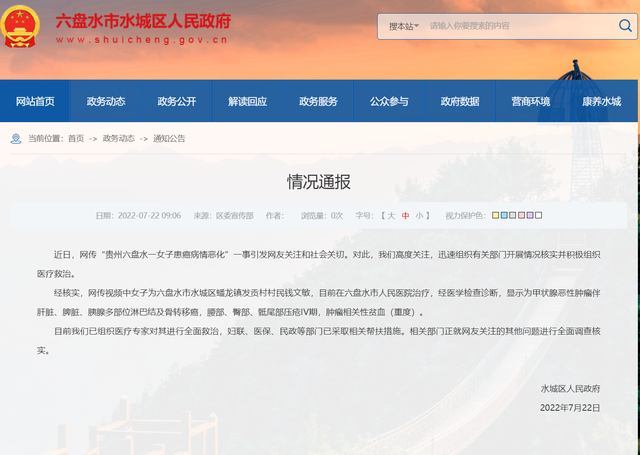 7月22日,六盘水市水城区政府发布的情况通报。近日,贵州六盘水市“一女子患癌病情恶化”一事引发社会关注。当地通报称,已组织医疗专家对其全面救治,正就网友关注的其他问题全面调查。7月22日,六盘水市人民医院重症医学科(ICU)一名工作人员告诉记者,患癌女子钱某敏22日凌晨4点多转入重症医学科,目前正在治疗当中。在此之前,她在该院肿瘤科治疗。22日上午,当地妇联的工作人员来看望过她。