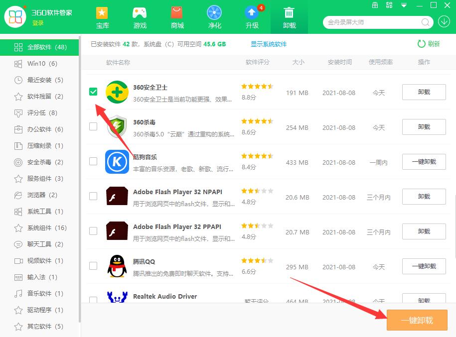 - 3选择软件一键卸载勾选360安全卫士,点击一键卸载。