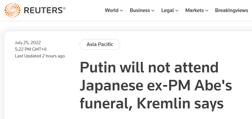 路透社:克里姆林宫称普京将不会出席日本前首相安倍的葬礼