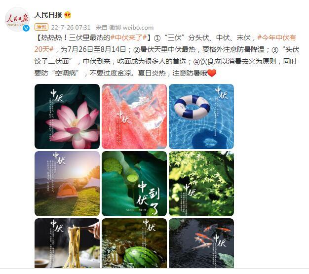 ①“三伏”分头伏、中伏、末伏,#今年中伏有20天#,为7月26日至8月14日;②暑伏天里中伏最热,要格外注意防暑降温;③“头伏饺子二伏面”,中伏到来,吃面成为很多人的首选;④饮食应以消暑去火为原则,同时要防“空调病”,不要过度贪凉。夏日炎热,注意防暑哦。