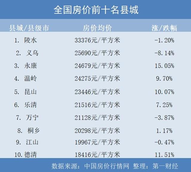 此外,虽然海南陵水房价下跌,但是截至目前仍有33376元/平方米,同比跌幅仅为1.2%,陵水县仍然是我国唯一一个房价破三万的县城。房价前十县城中,仅有浙江义乌跌幅最大,同比跌了8.14%,目前房价为25690元/平方米。