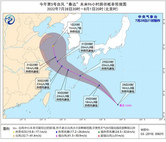 预计“桑达”将以每小时35公里左右的速度向西北方向移动,强度将有所加强。29日夜间移入东海东部,以后趋向黄海南部海域,强度明显减弱。