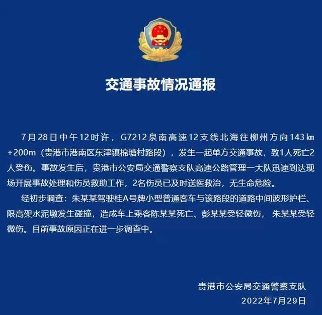 7月29日,广西贵港市公安局交通警察支队发布交通事故情况通报:7月28日中午12时许,G7212泉南高速12支线北海往柳州方向143㎞+200m(贵港市港南区东津镇棉塘村路段),发生一起单方交通事故,致1人死亡2人受伤。事故发生后,贵港市公安局交通警察支队高速公路管理一大队迅速到达现场开展事故处理和伤员救助工作,2名伤员已及时送医救治,无生命危险。