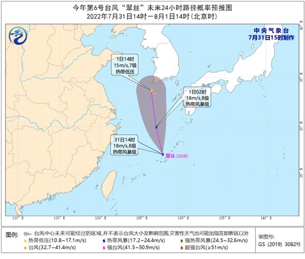 据中央气象台消息,今年第6号台风“翠丝”(热带风暴级,英文名称:Trases;名字来源:柬埔寨;名字意义:啄木鸟)已于今天(7月31日)下午生成,下午2点钟其中心位于日本冲绳那霸市北偏西方向约90公里的东海南部海面上,北纬27.0度、东经127.5度, 8级(18米/秒),998百帕,七级风圈半径120-280公里。预计,“翠丝”将以每小时25-30公里的速度快速向北偏西方向移动,强度变化不大,8月1日将在黄海南部海面减弱消散。