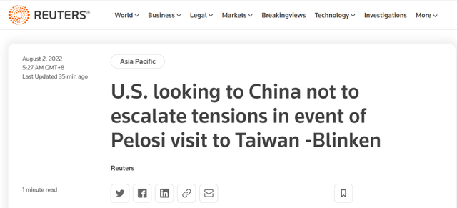 路透社报道截图报道称,布林肯在纽约参加联合国有关《不扩散核武器条约》审议大会结束后宣称,“如果议长决定访问台湾,而中国试图制造某种危机或以其他方式加剧紧张局势,那将完全是北京的责任”。