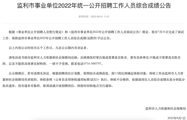 这份由监利市人社局8月1日上午发布的“综合成绩公告”显示,监利市7月31日完成了面试工作,现将综合成绩予以公告,公示时间为5个工作日,公示期满后,若对成绩无异议,将根据招聘岗位计划数,按综合成绩高低,按1:1的比例确定体检对象。