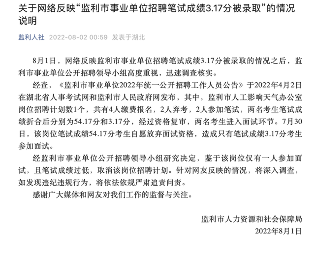 中国青年报客户端武汉8月2日电(中青报·中青网记者 朱娟娟)8月1日,湖北省监利市人民政府网站发布公告,监利市事业单位2022年统一公开招聘工作人员综合成绩公告附件表上,人工影响天气办公室岗位招考1人,排在第一的考生孙某某笔试3.17分、面试83.76分,另一考生徐某某笔试54.17分、面试0分。网友质疑招考存在不公平。8月2日凌晨,监利市人社局回应:经监利市事业单位公开招聘领导小组研究决定,鉴于这一岗位仅有1人参加面试,且笔试成绩过低,取消该岗位招聘计划。