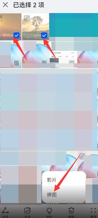 打开手机图库,选择两张图片,点击创作,选择拼图。