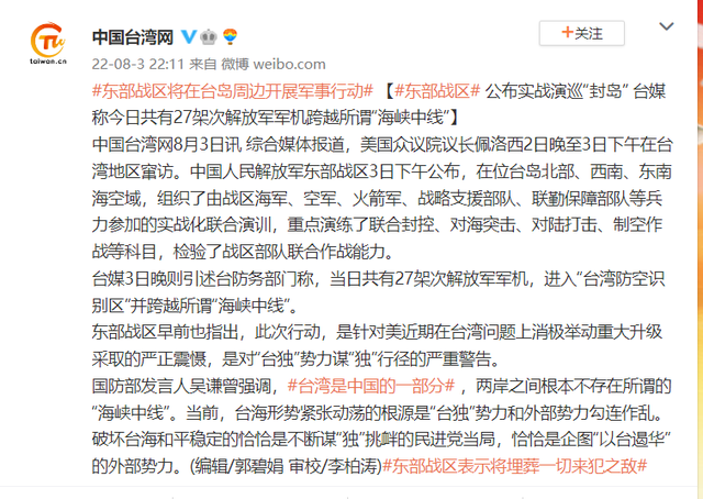 据中国台湾网,综合媒体报道,美国众议院议长佩洛西2日晚至3日下午在台湾地区窜访。中国人民解放军东部战区3日下午公布,在位台岛北部、西南、东南海空域,组织了由战区海军、空军、火箭军、战略支援部队、联勤保障部队等兵力参加的实战化联合演训,重点演练了联合封控、对海突击、对陆打击、制空作战等科目,检验了战区部队联合作战能力。