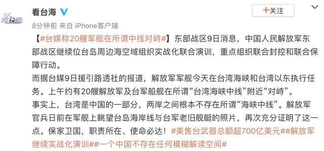 据@看台海 微博消息,台媒8月9日援引路透社的报道,解放军军舰今天在台湾海峡和台湾以东执行任务。上午约有20艘解放军及台军船舰在所谓“台湾海峡中线”附近“对峙”。