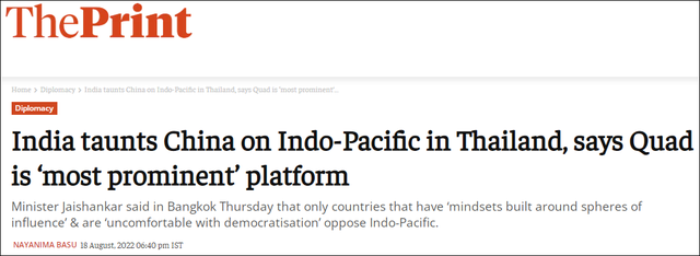 他称,“只有那些思维方式建立在‘围绕势力范围’和对全球事务的‘民主化’感到不安的人,才会在如今的‘印太地区’争论。”对于苏杰生的这段话,印媒“The Print”认为他在暗中批评中国。